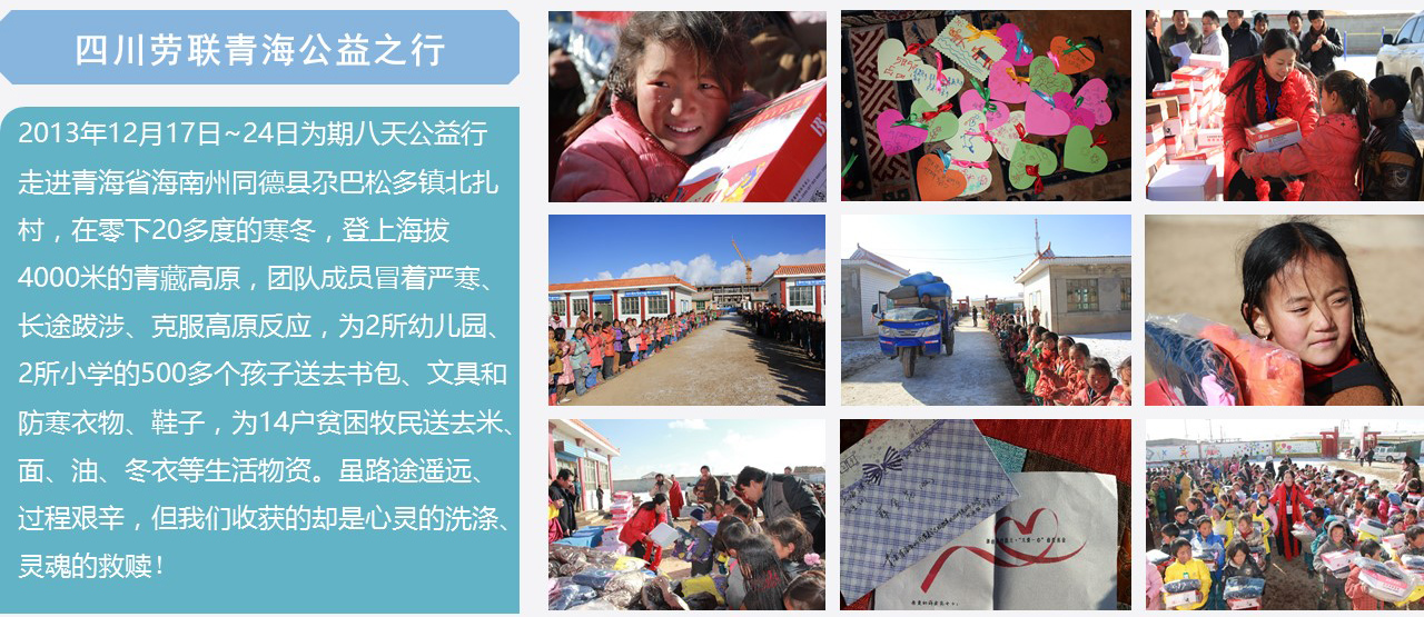 2013年12月17日~24日為期八天公益行走進青海省海南州同德縣尕巴松多鎮北扎村,在零下20多度的寒冬,登上海拔4000米的青藏高原,團隊成員冒著嚴寒、長途跋涉、克服高原反應,為2所幼兒園、2所小學的500多個孩子送去書包、文具和防寒衣物、鞋子,為14戶貧困牧民送去米、面、油、冬衣等生活物資。雖路途遙遠、過程艱辛,但我們收獲的卻是心靈的洗滌、靈魂的救贖!